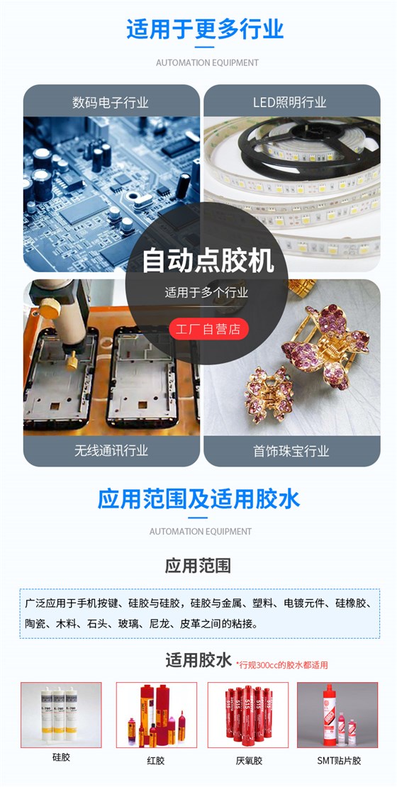 硅胶主动点胶机适用于硅胶与硅胶,硅胶与金属、塑料、尼龙、陶瓷、木材、玻璃、皮革、元件等原料粘连。